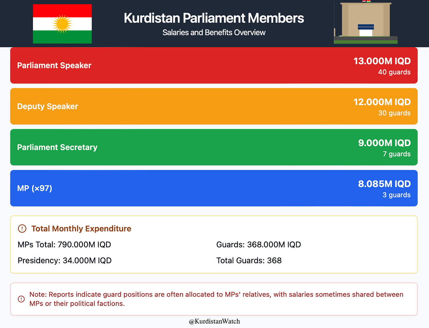 The public's perception of Members of Parliament is largely shaped by their financial status and earnings. As the Kurdistan Parliament's influence and prestige have declined, the position has increasingly attracted individuals primarily interested in its financial advantages - notably the substantial salary and guaranteed retirement benefits, along with potential unofficial income through various arrangements.